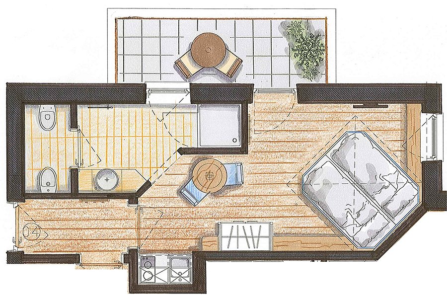 Più piccoli ma molto accoglienti, gli appartamenti tipo "studio" sono dotati di TV LCD 32'' satellitare, connessione ad Internet, cassetta di sicurezza, piastre in ceramica per la cottura, frigorifero, tostapane, macchina caffè Nespresso su richiesta, riscaldamento indipendente, scaldasalviette, biancheria da letto con piumini anallergici, tavolino esterno in legno, stoviglie e kit cucina.